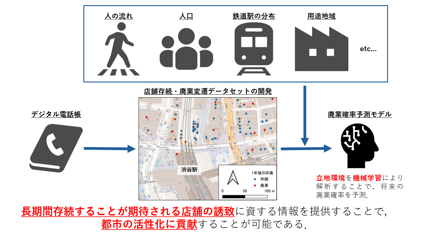 近年,日本では全国的な店舗数の減少に伴い,空き店舗の増加が続いており,特に商店街における空き店舗の増加とそれに伴う商店街の魅力と活力の低下が課題となっています.そこで,空き店舗が増加しつつある商店街では,新たな店舗を誘致することで,この課題の解決を図ろうとしています.しかし,計画性の低い店舗誘致は短期間での廃業に至り,周辺の不動産価値をさらに低下させる事例も報告されています.一方,一部の大企業は,各店舗の売上や来客数などの詳細なデータをもとに出店計画を立案していますが,中小企業はこれらのデータを保有していないため,十分な出店計画を検討することが困難です.そこで,本研究ではデジタル電話帳とオープンデータを用いて,店舗の将来廃業確率を予測するモデルを構築し,出店後に長期間存続することが期待される店舗の誘致を支援する技術の開発を行います.