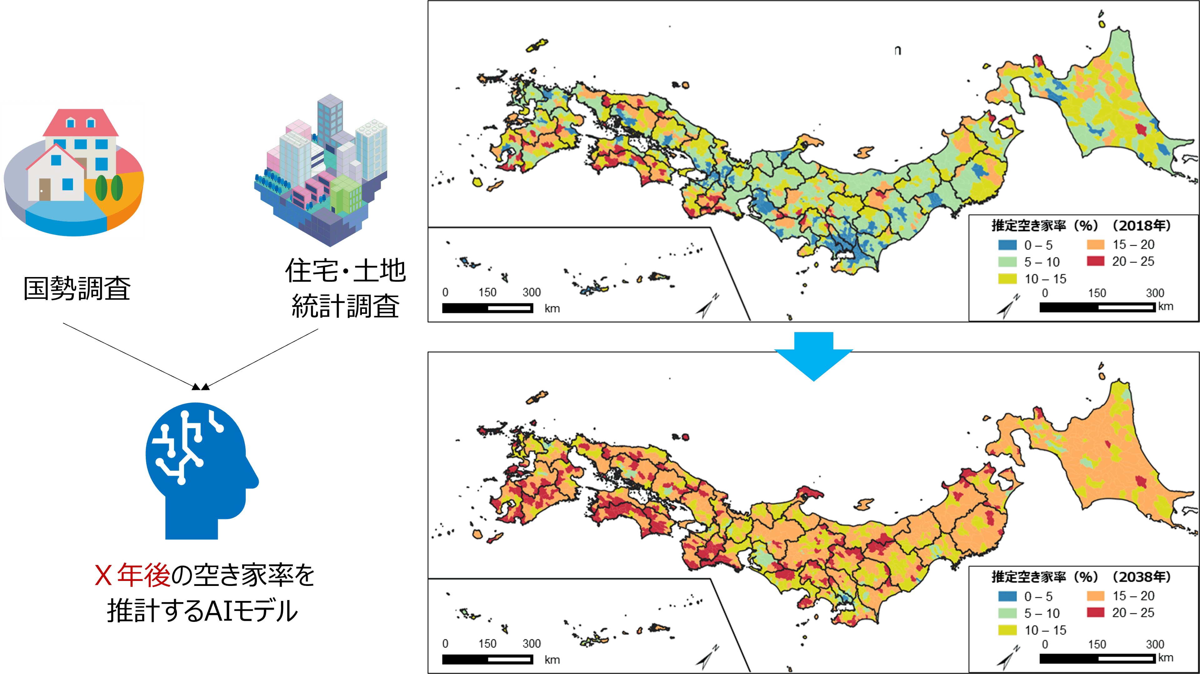 近年,日本の空き家は増加傾向にあり、この傾向は今後も続くと予測されています.国や自治体は,空き家に関する法律の整備や対策計画を立てて,将来的な空き家発生の抑制や流通を促進しようとしています.しかし,これまで現在から将来にかけて空き家がどの程度存在するのかを効率的に把握する方法は,研究レベルでもほとんど確立されていませんでした.そこで本研究では,日本全国同一の基準で整備され,更新され続けている政府統計と最新のAI技術を組み合わせることで,将来の空き家空間分布把握をする技術の開発を進めています.