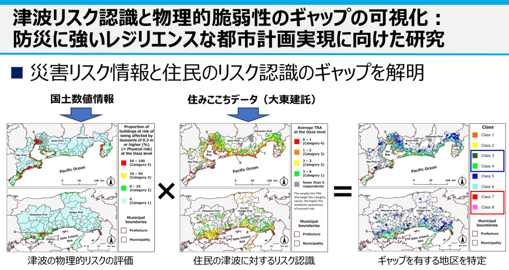 近年,各地の沿岸都市において津波災害への備えが進められている一方で,住民の津波リスク認識(TRA)と実際の物理的脆弱性との間にギャップが存在する可能性が指摘されています.本研究では,このギャップに着目し,TRAデータと津波浸水想定,住宅建物分布などの地理空間データを統合し,GISを用いて大字単位での空間分析を行う手法を構築しています.これにより,物理的リスクが高いにもかかわらず認識が低い地域を特定し,防災上の重点対策エリアを明確化することが可能となります.本研究の結果を活用して真に津波による被害の危険性が高い地域を特定し,津波レジリエンス向上に貢献していきます.